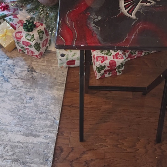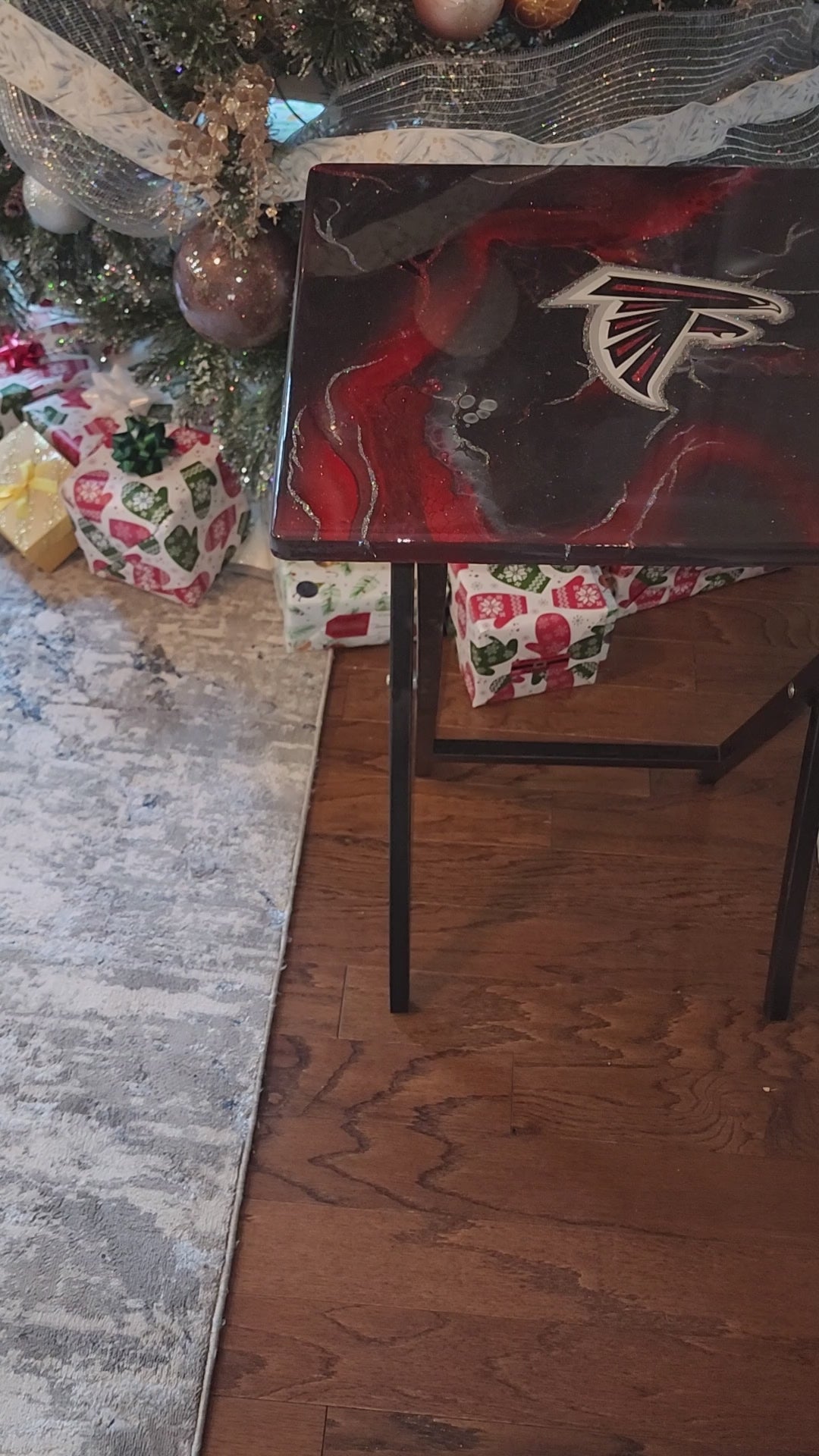 Atlanta Falcons tray table! This folding tray table is unique and is designed with Falcons fans in mind. The tables top is 14.4" x 19", and 26" tall, crafted from wood. A glasslike, durable resin coating will provide a protective barrier that safeguards the artistic design from scratches, spills and fading.