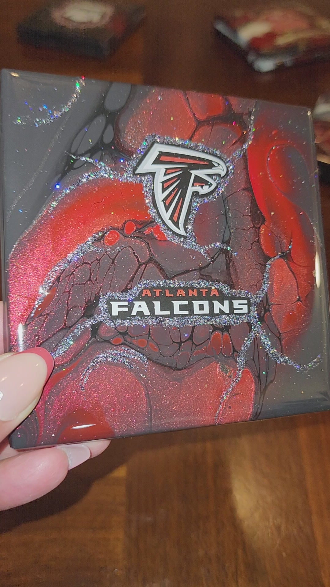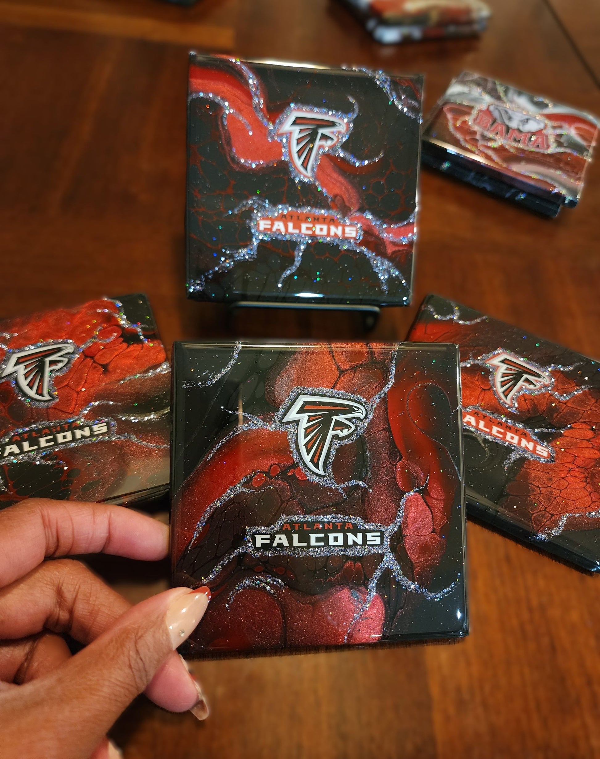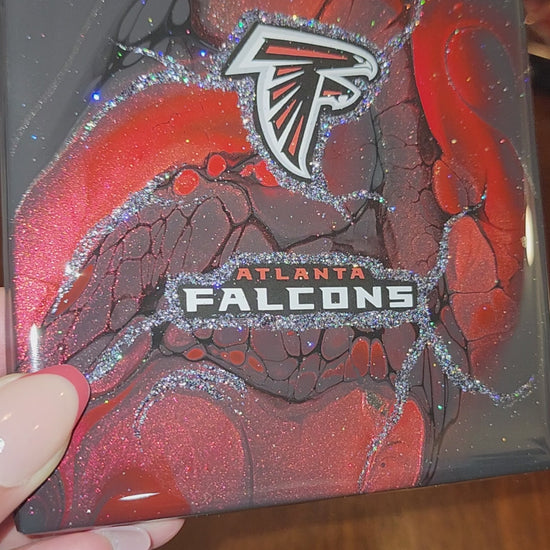 Show your team pride in style with this stunning set of four handcrafted coasters and a coordinating storage holder. Perfect for the ultimate Atlanta Falcons fan, these coasters aren't just practical—they are a piece of vibrant, functional art designed to elevate your game-day experience or daily decor.