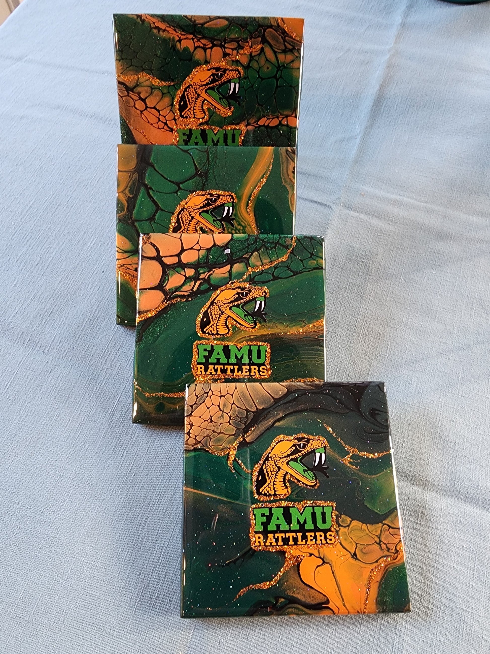 Florida A&M themed Coasters. Show your love for your University with this set of set of 4 square coasters, each 4"piece is uniquely hand painted with a glamourous resin finish and sparkle. A perfect way to add a special touch to any table setting with functional art that will always be a conversation starter.